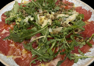 Finísimas láminas de carne seleccionada, marinadas sutilmente para realzar su sabor natural. Servido con un delicado aderezo que equilibra notas frescas y aromáticas, queso curado y un toque de frutos secos o aceite de calidad, creando un plato elegante, ligero y lleno de matices.