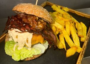 Jugoso entrecot de lomo alto cocinado a las brasas, que potencia su sabor natural y le aporta un ligero aroma ahumado. Acompañado de su guarnición cuidadosamente seleccionada, combina textura, sabor y equilibrio, ofreciendo un plato contundente, elegante y lleno de carácter.